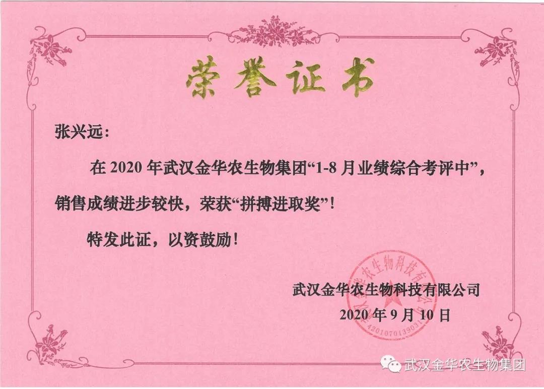 祝賀廣東張興遠(yuǎn)經(jīng)理,他在2020年武漢金華農(nóng)生物集團(tuán)“1-8月業(yè)績綜合考評中”銷售成績進(jìn)步較快,他拼搏進(jìn)取,踴躍報(bào)貨,榮獲武漢金華農(nóng)老人團(tuán)隊(duì)“拼搏進(jìn)取獎”,他是一位優(yōu)秀的“老武漢金華農(nóng)人”,為他鼓掌!為他點(diǎn)贊!