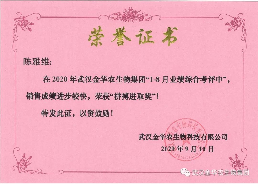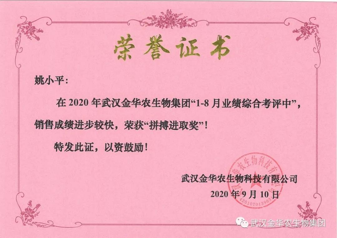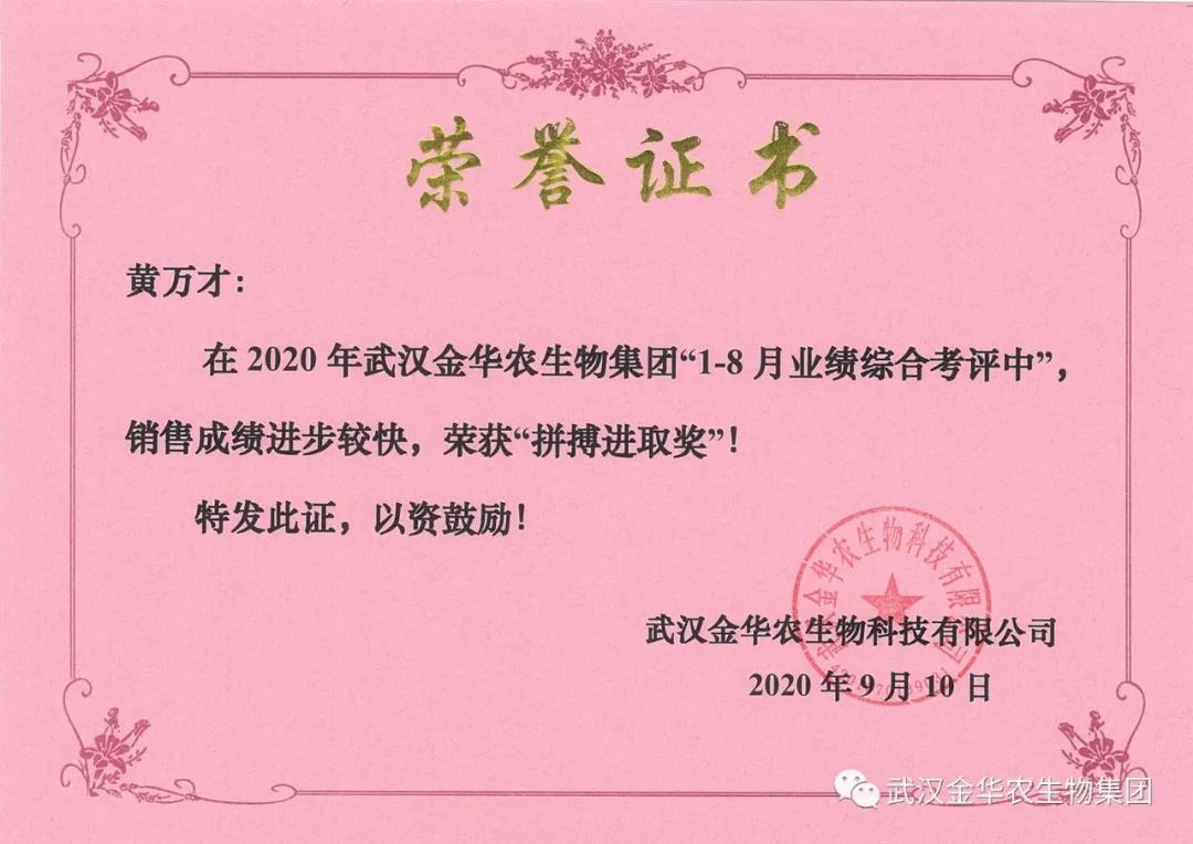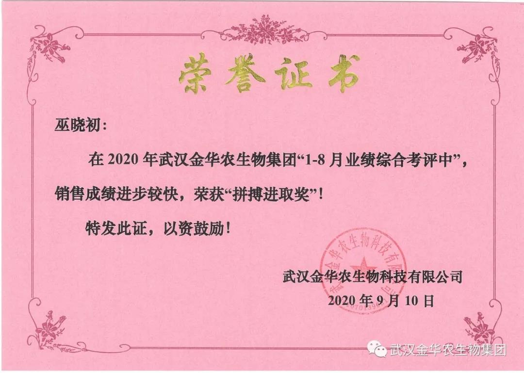 祝賀福建巫曉初經(jīng)理,他在2020年武漢金華農(nóng)生物集團(tuán)“1-8月業(yè)績綜合考評中”銷售成績進(jìn)步較快,他拼搏進(jìn)取,踴躍報(bào)貨,榮獲武漢金華農(nóng)老人團(tuán)隊(duì)“拼搏進(jìn)取獎”,他是一位優(yōu)秀的“老武漢金華農(nóng)人”,為他鼓掌!為他點(diǎn)贊!