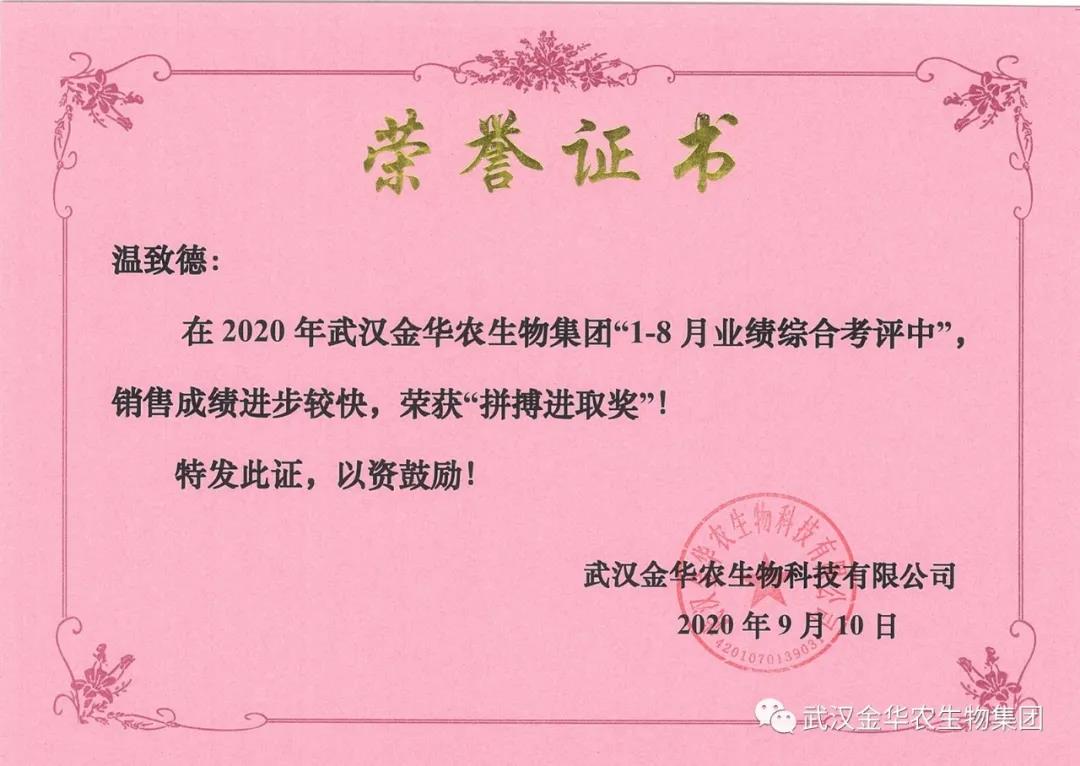 祝賀江西溫致德經(jīng)理,他在2020年武漢金華農(nóng)生物集團(tuán)“1-8月業(yè)績綜合考評中”銷售成績進(jìn)步較快,他拼搏進(jìn)取,踴躍報(bào)貨,榮獲武漢金華農(nóng)老人團(tuán)隊(duì)“拼搏進(jìn)取獎”,他是一位優(yōu)秀的“老武漢金華農(nóng)人”,為他鼓掌!為他點(diǎn)贊!