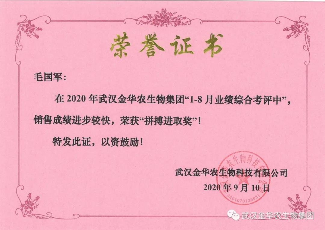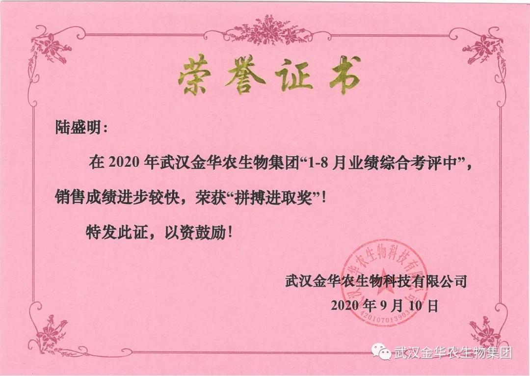祝賀廣西陸盛明經(jīng)理,他在2020年武漢金華農(nóng)生物集團(tuán)“1-8月業(yè)績綜合考評中”銷售成績t步較快,他拼搏進(jìn)取,踴躍報(bào)貨,榮獲武漢金華農(nóng)老人團(tuán)隊(duì)“拼搏進(jìn)取獎”,他是一位優(yōu)秀的“老武漢金華農(nóng)人”,為他鼓掌!為他點(diǎn)贊!