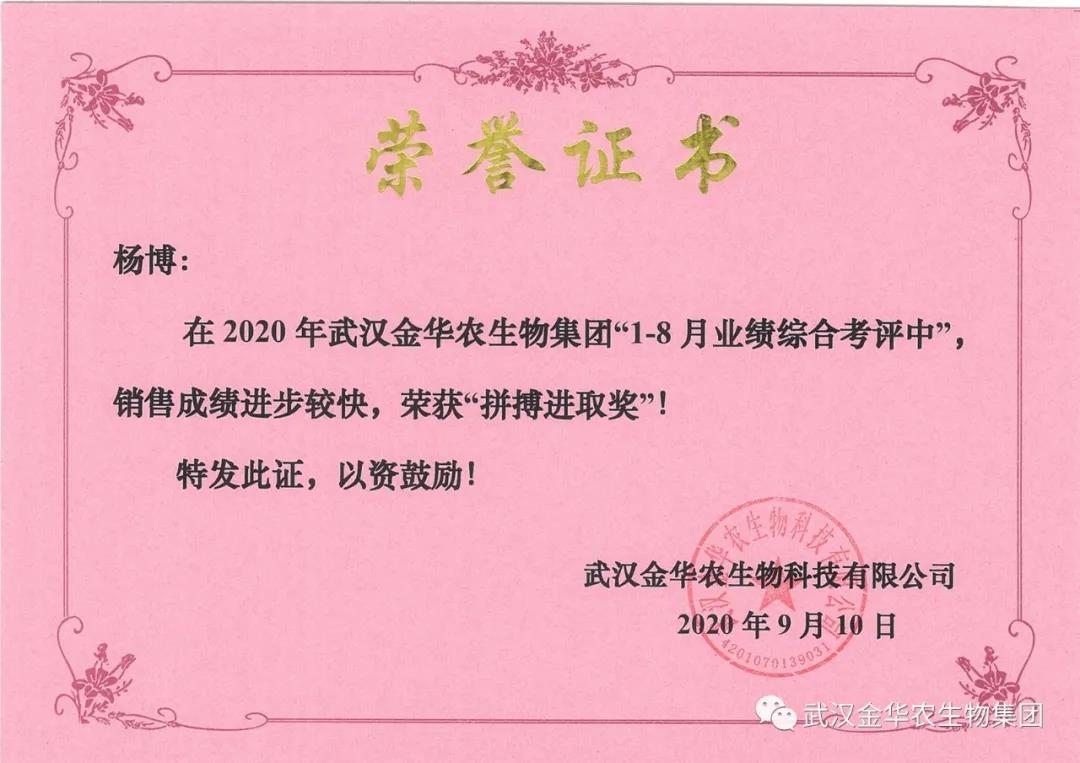 祝賀黑龍江楊博經(jīng)理,他在2020年武漢金華農(nóng)生物集團(tuán)“1-8月業(yè)績綜合考評中”銷售成績進(jìn)步較快,他拼搏進(jìn)取,踴躍報(bào)貨,榮獲武漢金華農(nóng)老人團(tuán)隊(duì)“拼搏進(jìn)取獎”,他是一位優(yōu)秀的“老武漢金華農(nóng)人”,為他鼓掌!為他點(diǎn)贊!