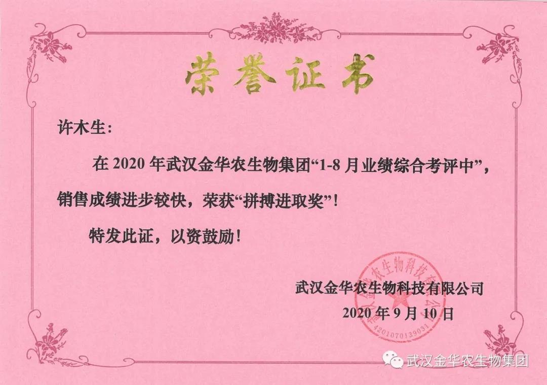 祝賀山東許木生經(jīng)理,他在2020年武漢金華農(nóng)生物集團(tuán)“1-8月業(yè)績綜合考評中”銷售成績進(jìn)步較快,他拼搏進(jìn)取,踴躍報(bào)貨,榮獲武漢金華農(nóng)老人團(tuán)隊(duì)“拼搏進(jìn)取獎”,他是一位優(yōu)秀的“老武漢金華農(nóng)人”,為他鼓掌!為他點(diǎn)贊!