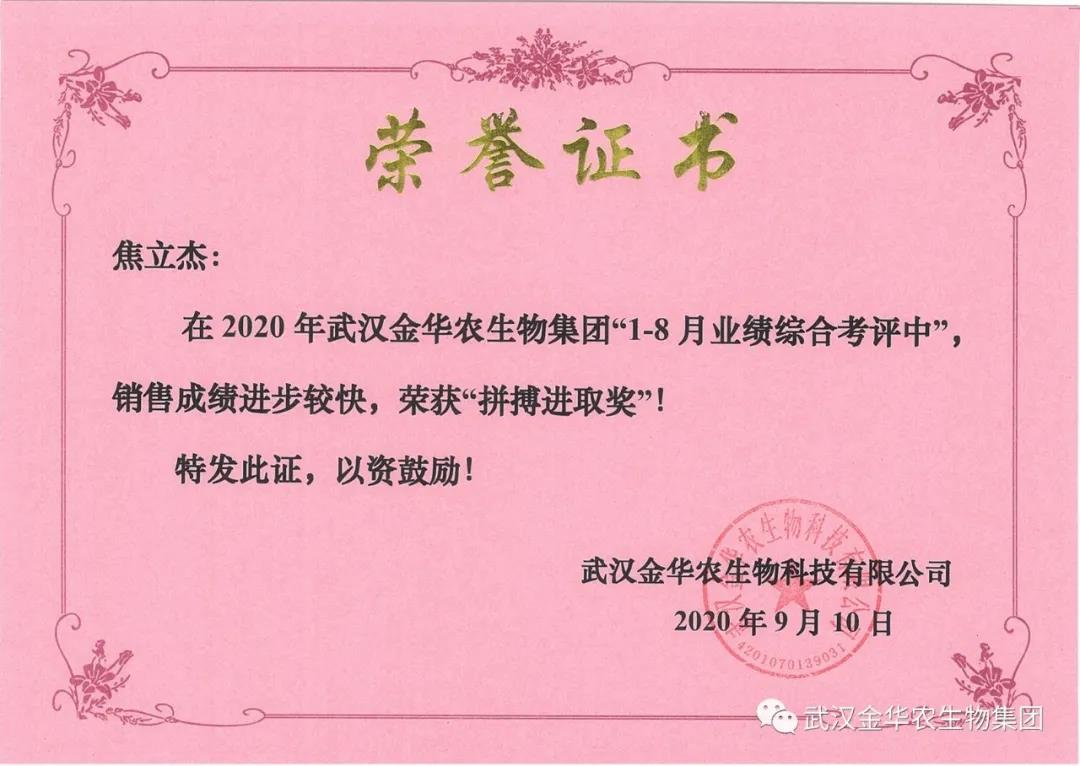祝賀河北焦立杰經(jīng)理,他在2020年武漢金華農(nóng)生物集團(tuán)“1-8月業(yè)績綜合考評中”銷售成績進(jìn)步較快,他拼搏進(jìn)取,踴躍報(bào)貨,榮獲武漢金華農(nóng)老人團(tuán)隊(duì)“拼搏進(jìn)取獎”,他是一位優(yōu)秀的“老武漢金華農(nóng)人P,為他鼓掌!為他點(diǎn)贊!