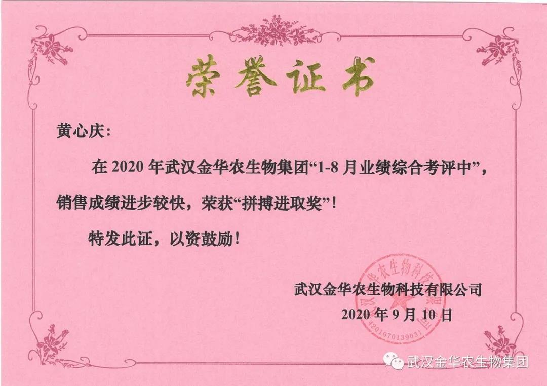 祝賀海南黃心慶經(jīng)理,他在2020年武漢金華農(nóng)生物集團(tuán)“1-8月業(yè)績綜合考評中”銷售成績進(jìn)步較快,他拼搏進(jìn)取,踴躍報(bào)貨,榮獲武漢金華農(nóng)老人團(tuán)隊(duì)“拼搏進(jìn)取獎”,他是一位優(yōu)秀的“老武漢金華農(nóng)人”,為他鼓掌!為他點(diǎn)贊!