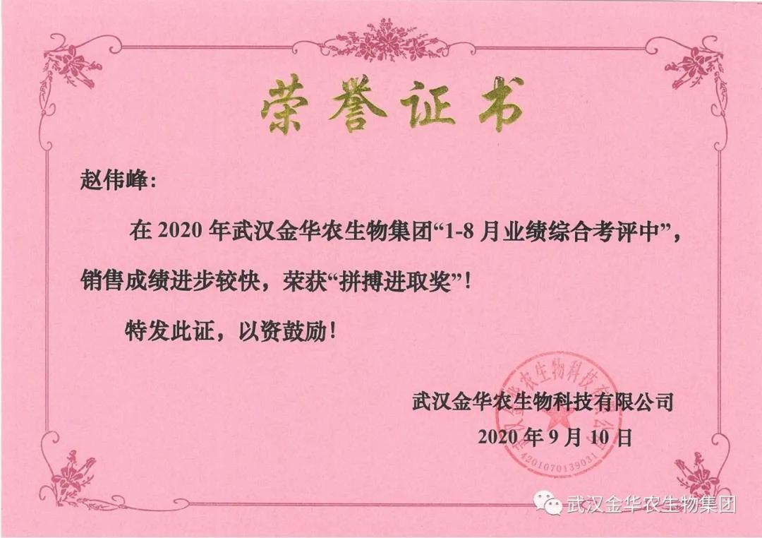 祝賀河南趙偉峰經(jīng)理,他在2020年武漢金華農(nóng)生物集團(tuán)“1-8月業(yè)績綜合考評中”銷售成績進(jìn)步較快,他拼搏進(jìn)取,踴躍報(bào)貨,榮獲武漢金華農(nóng)老人團(tuán)隊(duì)“拼搏進(jìn)取獎”,他是一位優(yōu)秀的“>武漢金華農(nóng)人”,為他鼓掌!為他點(diǎn)贊!