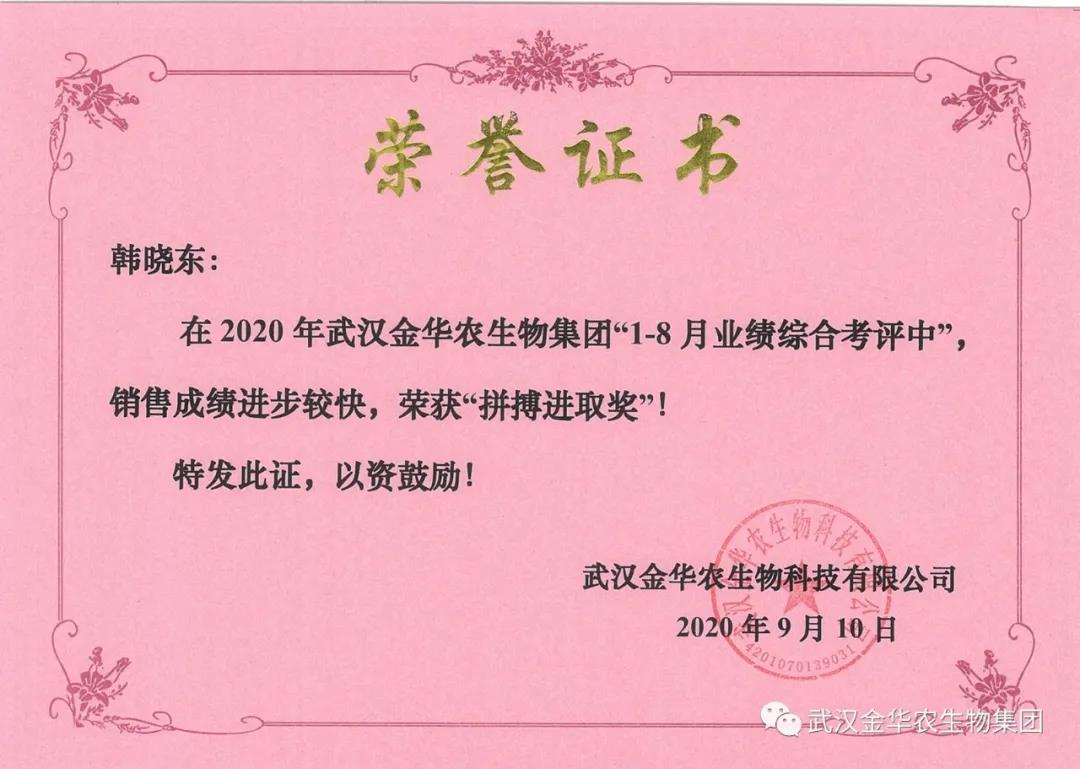 祝賀安徽韓曉東經(jīng)理,他在2020年武漢金華農(nóng)生物集團(tuán)“1-8月業(yè)績綜合考評中”銷售成績進(jìn)步較快,他拼搏進(jìn)取,踴躍/貨,榮獲武漢金華農(nóng)新人團(tuán)隊(duì)“拼搏進(jìn)取獎”,他是一位優(yōu)秀的“新晉武漢金華農(nóng)人”,為他鼓掌!為他點(diǎn)贊!
