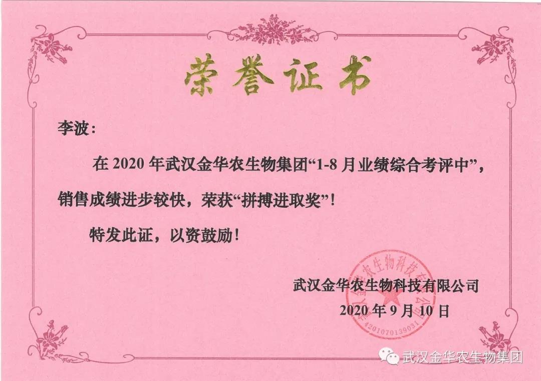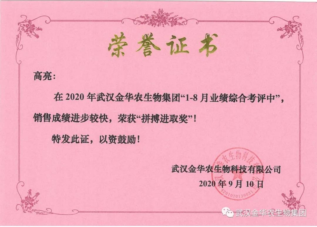 祝賀河南高亮經(jīng)理,他在2020年武漢金華農(nóng)生物集團(tuán)“1-8月業(yè)績N合考評中”銷售成績進(jìn)步較快,他拼搏進(jìn)取,踴躍報(bào)貨,榮獲武漢金華農(nóng)新人團(tuán)隊(duì)“拼搏進(jìn)取獎”,他是一位優(yōu)秀的“新晉武漢金華農(nóng)人”,為他鼓掌!為他點(diǎn)贊!