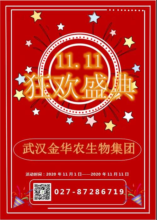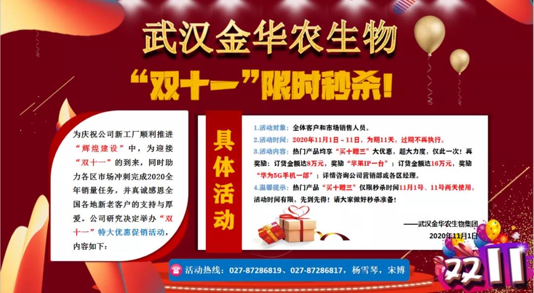 ? ? ?為慶祝公司新工廠順利推進(jìn)“輝煌建設(shè)”中,為真誠感恩在這段不平凡歲月中奮戰(zhàn)在動(dòng)保銷售一線的武漢金華農(nóng)同仁,為迎接“雙十一”的到來,同時(shí)助力各區(qū)市場沖刺完成2020全年銷量任務(wù)。弘揚(yáng)“公司發(fā)展我成長,我為公司添光彩”,“人人爭當(dāng)冠軍,人人爭當(dāng)標(biāo)兵”的企業(yè)文化精神,并真誠感恩全國各地新老客戶的支持與厚愛。公司研究決定舉辦“雙十一”特大優(yōu)惠促銷活動(dòng)!年僅一次,超大力度!活動(dòng)內(nèi)容如下:? ? ?