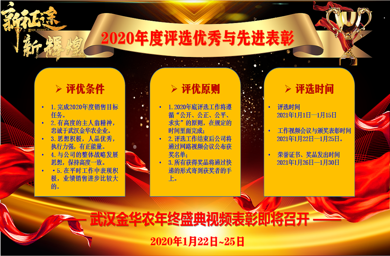 ? ? 在現(xiàn)今到來的2021年時間里,讓我們統(tǒng)一思想,統(tǒng)一步伐,堅定信念,斗志昂揚,積極行動,全面沖刺2021年銷售目標任務(wù)。2021年1月份又將是一個新的起點、一個新的開始,事事早,成功早!公司號召全體武漢金華農(nóng)同志們,人人爭當冠軍,人人爭當標兵!