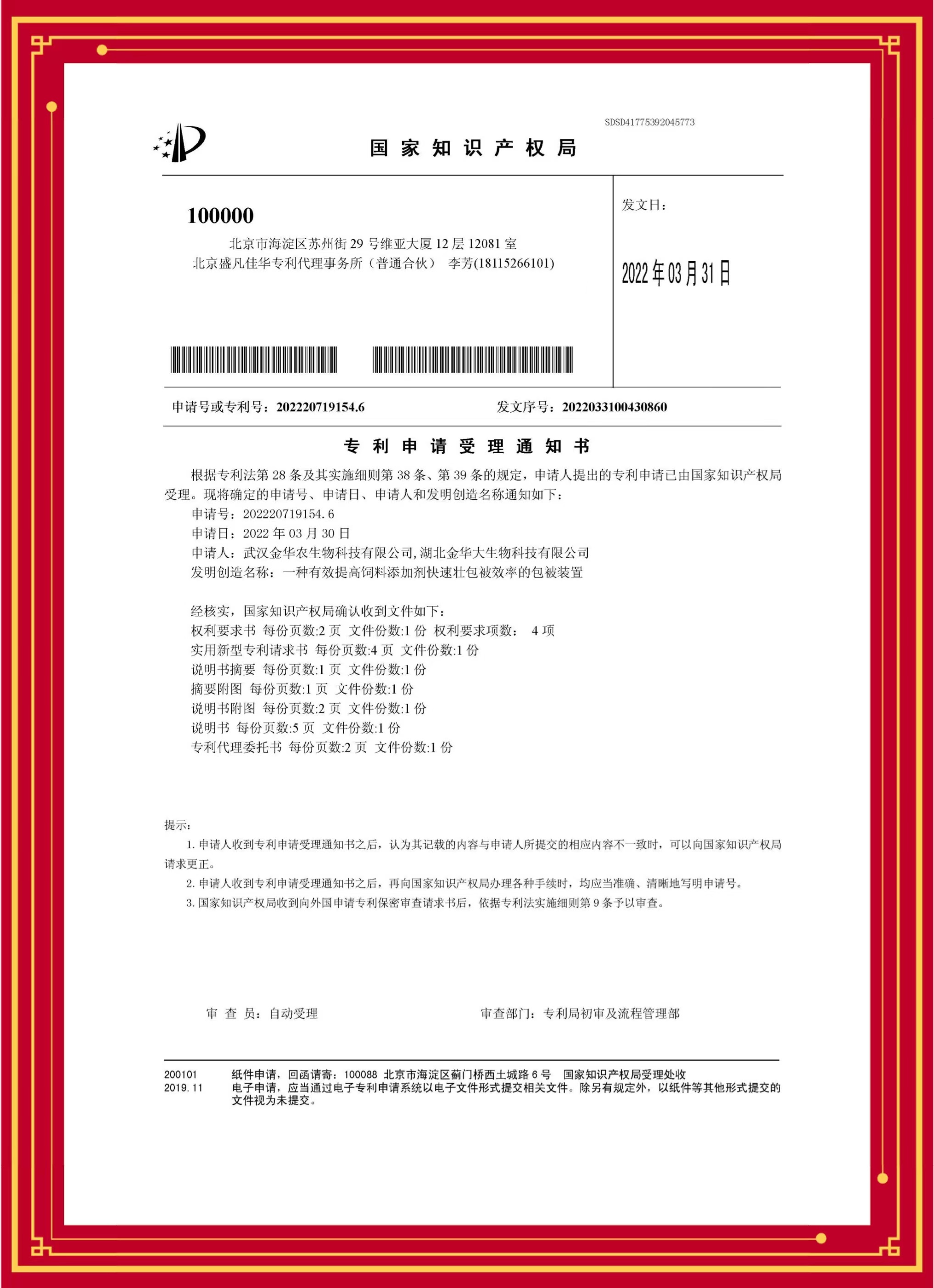 ? ? 近日,武漢金華農(nóng)申請的首批三個產(chǎn)品“優(yōu)樂肽、快速壯、氟泰肺寧”科技發(fā)明專利?!兑环N提高優(yōu)樂肽營養(yǎng)添加劑發(fā)酵效率的發(fā)酵裝置》,專利號:20220701568.6;《一種有效提高飼料添加劑快速壯包被效率的包被裝置》,專利號:202220719154.6;《一種提高氟泰肺寧粉劑粉碎效率的粉碎裝置》,專利號:20220701581.1,獲得國家知識產(chǎn)權(quán)局授權(quán),并獲得專利受理證書。