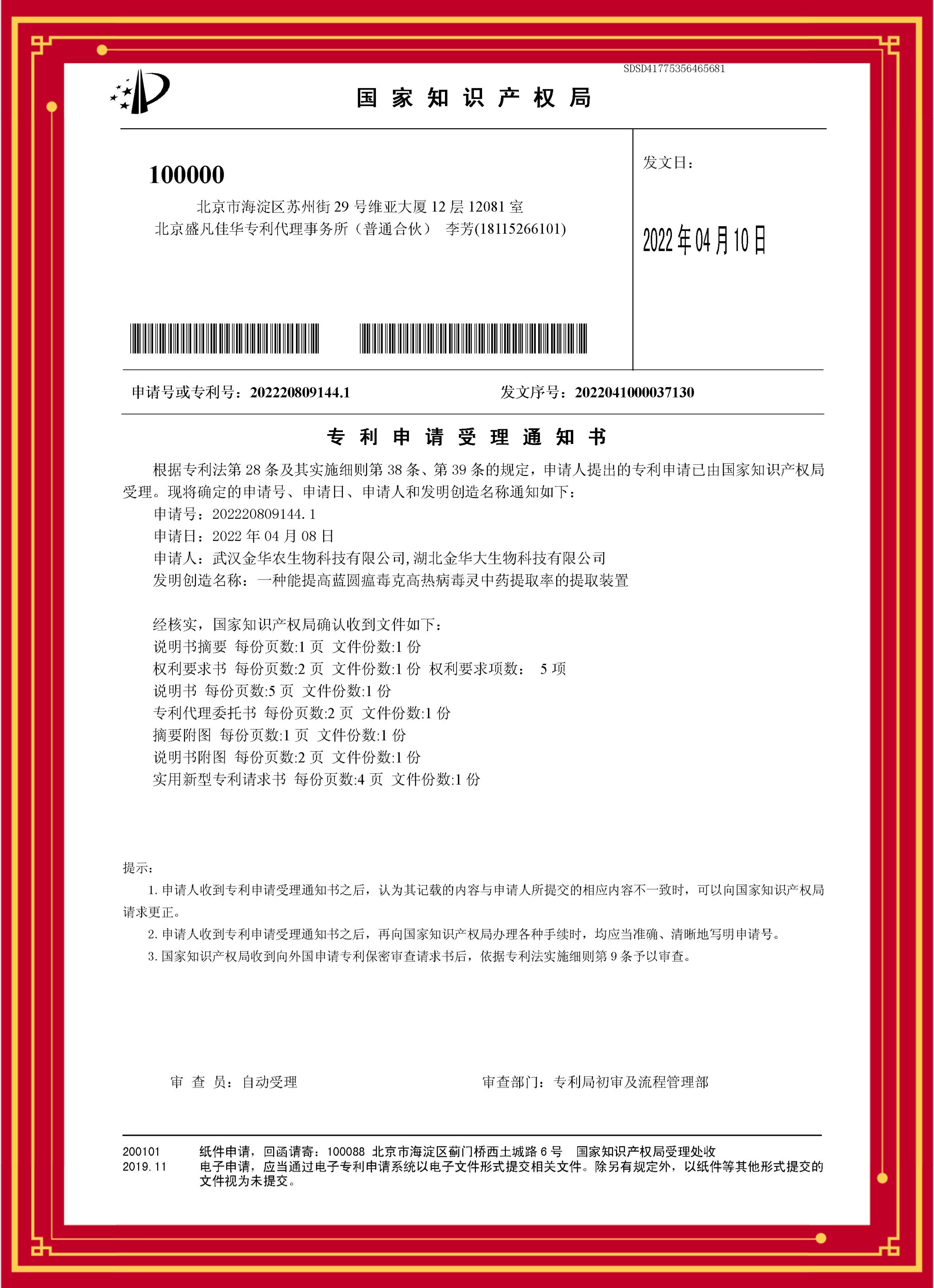 ? ? 繼首批“優(yōu)樂肽、快速壯、氟泰肺寧”產(chǎn)品榮獲專利證書后,近日,武漢金華農(nóng)又一批拳頭產(chǎn)品獲得專利證書。產(chǎn)品“藍圓瘟毒克、金替呼諾、高熱病毒靈”科技發(fā)明專利,《一種能提高藍圓瘟毒克高熱病毒靈中藥提取率的提取裝置》,專利號:202220809144.1;《一種提高金替呼諾預混劑混合效率的混合裝置》,專利號:202220809977.8,獲得國家知識產(chǎn)權局授權,并獲得專利受理證書。