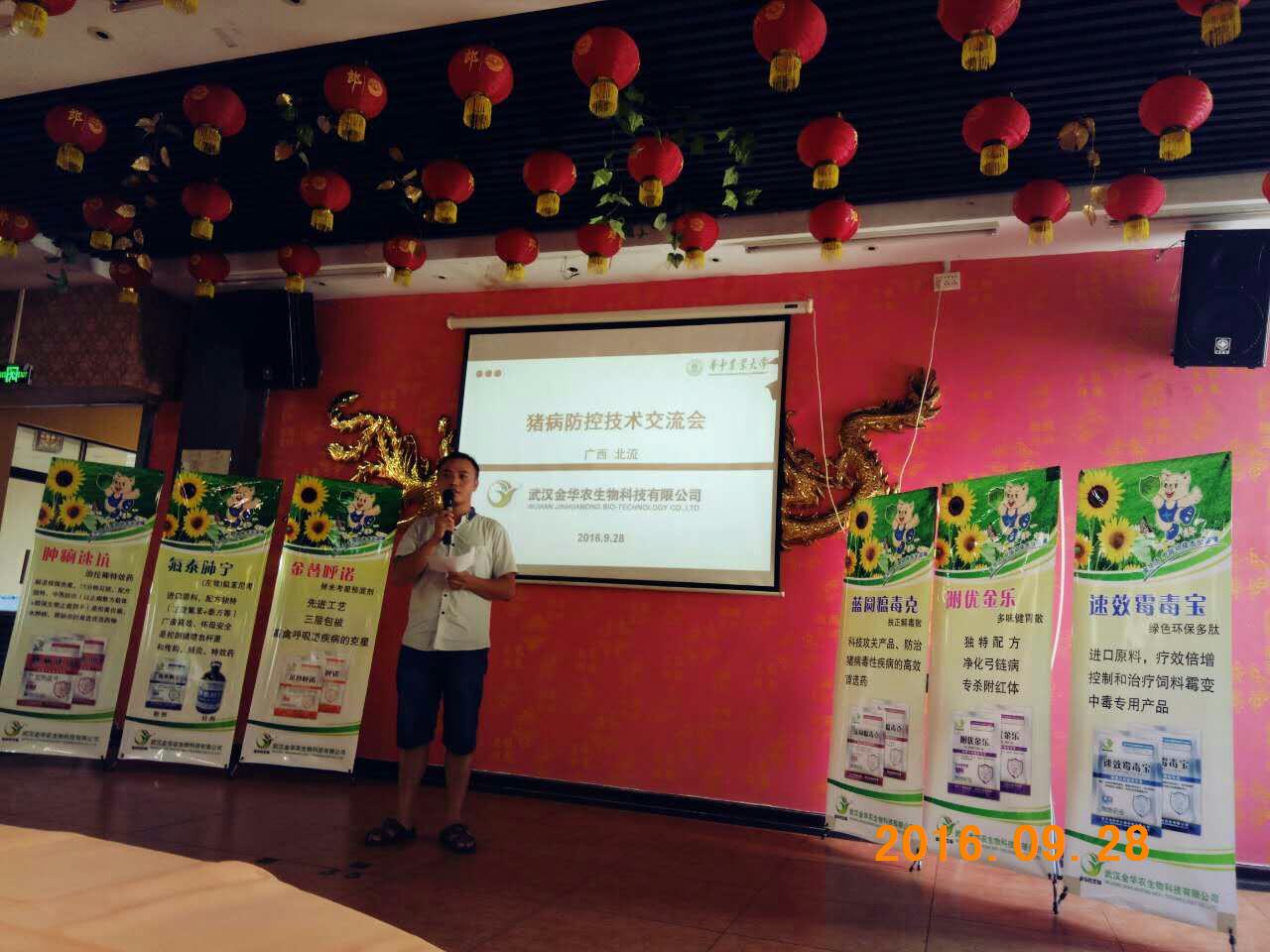 9月27-28日,公司廣西市場“秋冬季豬病防控研討會”勝利召開!本次會議由公司領導常務副總徐巍博士做企業介紹及公司“一三五”戰略發展規劃,公司技術部唐友琦老師主講,玉林北流地區負責人曹玉廣經理策劃與組織。現場客戶40多人參加會議,雖然很多都是新客戶,但是使用武漢金華農產品后,都覺得產品質量過硬,臨床效果十分顯著,豬病技術服務十分優秀,會議最后大家激情都很高,贏得一片片喝彩掌聲,會議取得良好的效果,當場收現金7萬多元,預計后期拜訪總銷量達12萬以上!祝賀優秀新人-曹玉廣經理首戰告捷!