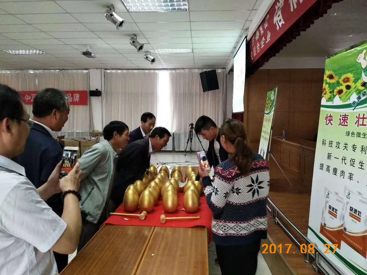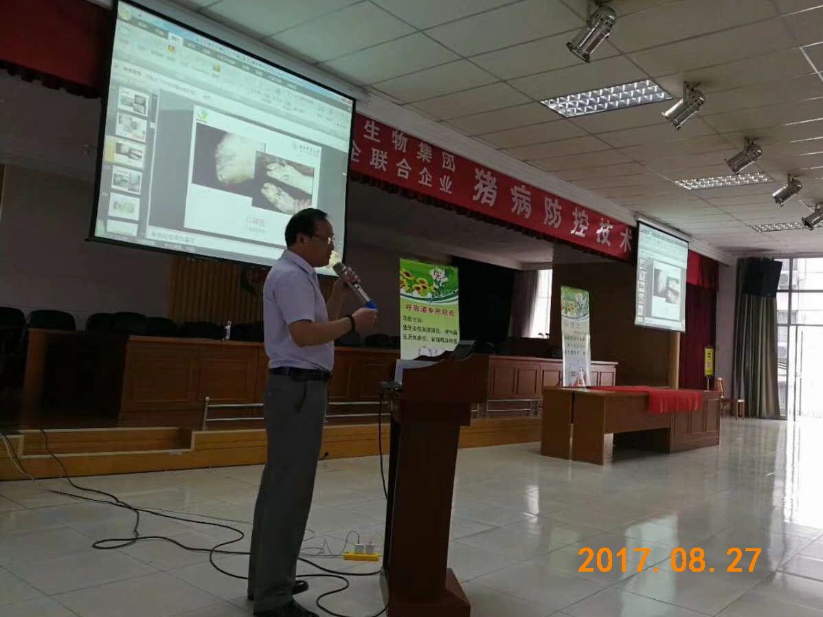 喜訊:8月27日,武漢金華農(nóng)生物2017年秋季豬病防控技術(shù)交流會議在甘肅市場取得圓滿成功。本次會議由甘肅大區(qū)楊勝利老師、楊斌經(jīng)理組織策劃,公司技術(shù)部吳志良老師主講。雖然當(dāng)天天降大雨,但依然阻擋不了各位豬場老板的熱情,早早地就有60多位趕到會議現(xiàn)場。通過本次豬病會議的交流,大家一致認(rèn)為:武漢金華農(nóng)產(chǎn)品質(zhì)量過硬、臨床療效顯著、企業(yè)美譽(yù)度高。
