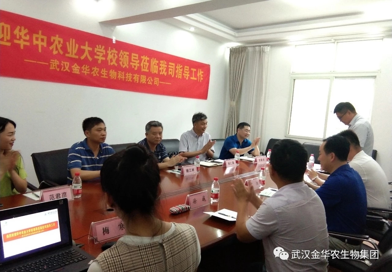 2019年6月12日,華中農(nóng)業(yè)大學(xué)黨委副書記、副校長(zhǎng)姚江林,華中農(nóng)業(yè)大學(xué)資產(chǎn)經(jīng)營(yíng)與后勤保障部部長(zhǎng)李寒,華中農(nóng)業(yè)大學(xué)校友與基金工作辦公室主任楊仁海,華中農(nóng)業(yè)大學(xué)資產(chǎn)經(jīng)營(yíng)與后勤保障部副部長(zhǎng)劉春全,一行4人蒞臨武漢金華農(nóng)生物科技有限公司,就雙方深入開展校企聯(lián)合等工作進(jìn)行會(huì)談交流。