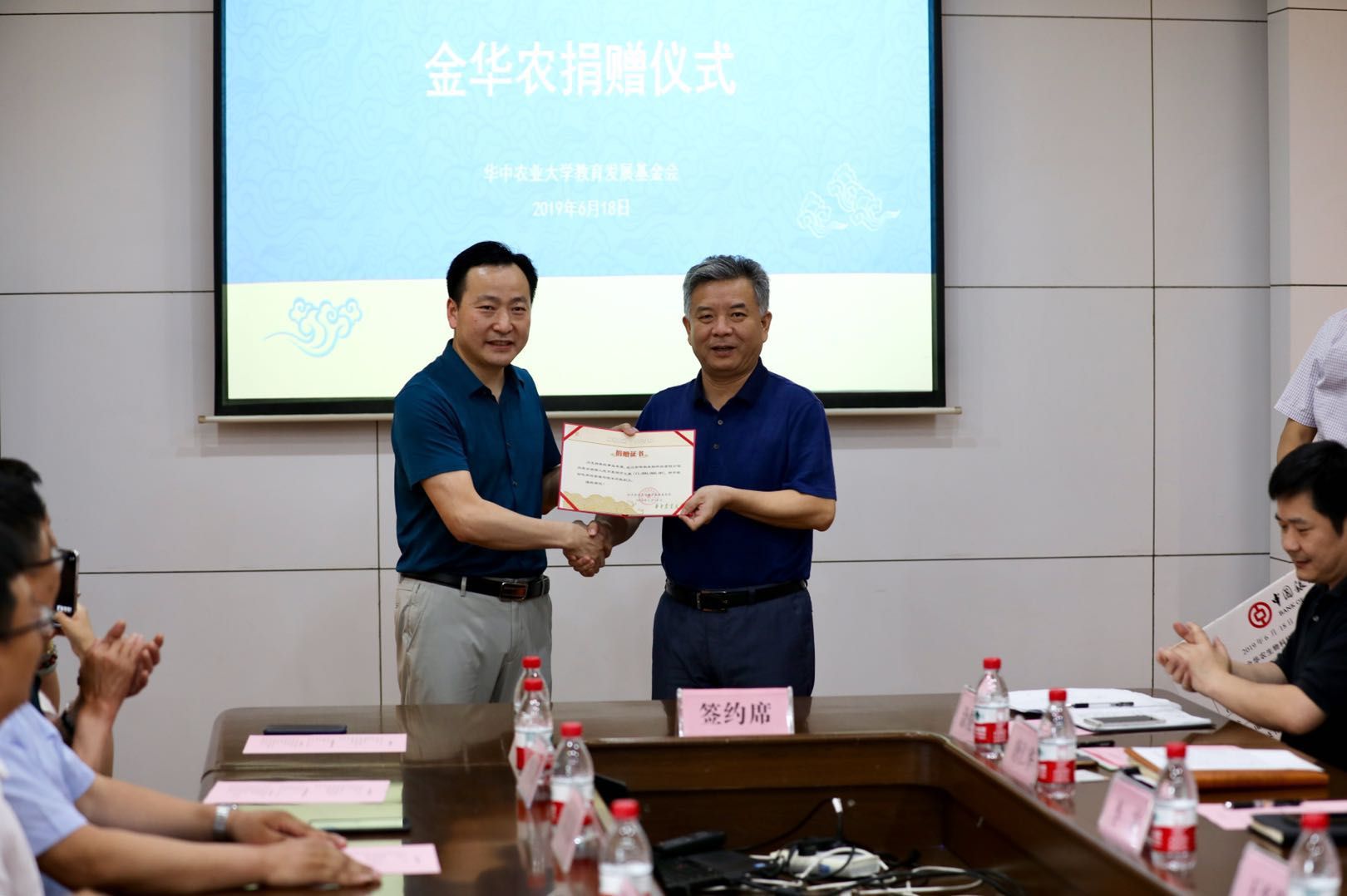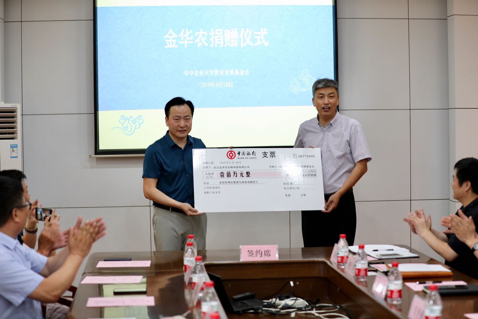 ? ??2019年6月18日,華中農(nóng)業(yè)大學(xué)“獎(jiǎng)教金”設(shè)立儀式在該校行政樓會(huì)議室舉行,此次,武漢金華農(nóng)生物科技有限公司向該校捐贈(zèng)100萬元,用于獎(jiǎng)勵(lì)華中農(nóng)業(yè)大學(xué)優(yōu)秀的管理與服務(wù)崗教職工。